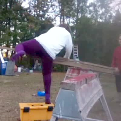 2 men sit on opposite ends of a fallen tree wedged between other trees. Men rock up and down like they're on a seesaw. The tree breaks when man on the left rocks too hard.