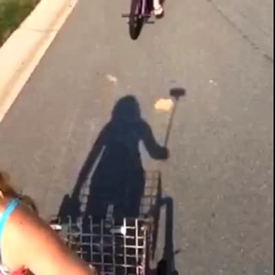 A teenage girl rides her bicycle into her friend carrying a selfie stick.