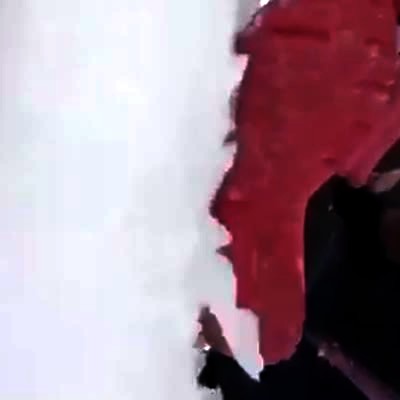 A teen girl uses a selfie stick to films herself as she rides an inflatable tube backwards down a snow slide and she crashes into another rider at the bottom of the slide.