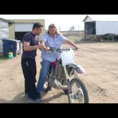 Senior woman rides motocross bike & loses control. The front end of the motorcycle goes up, she falls off & narrowly misses a metal garage.