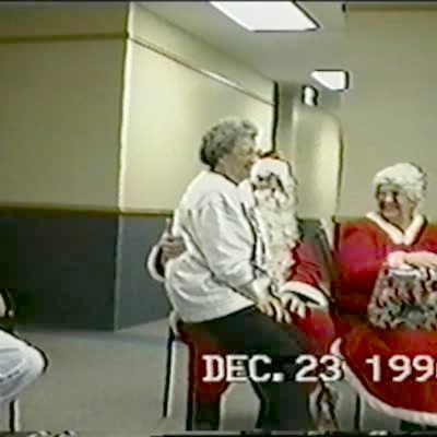 (RS) - senior woman sits on Santa's lap & whoopee cushion; X-mas