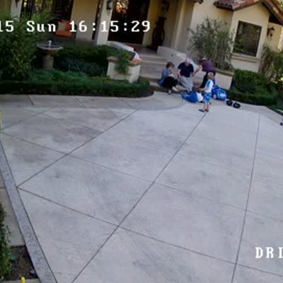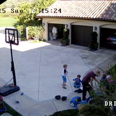 *This video has a second angle with clip #715229* In security camera footage, a senior man runs in a driveway as his grandson chases him in a game of Duck-Duck-Goose before he trips and falls into a bush before two women help pull him out and they resume the game as one of the women grabs paper towels for the man's head. No sound.