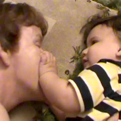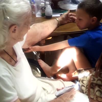 A little boy plays with an old woman's arm fat indoors, amusing the man behind the camera.