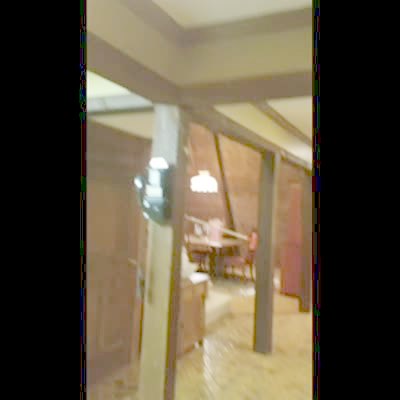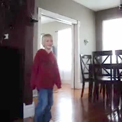 A senior woman races a young girl from the kitchen away from the camera to the living room. As they run back toward the camera and the kitchen, the senior woman slips and falls on the floor. Short heads & tails.