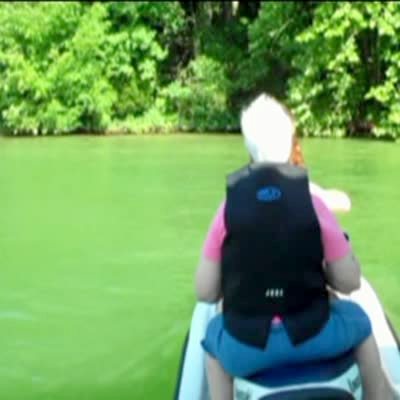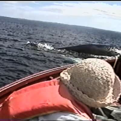 "A Whale of a Tale" Senior woman sits at the front of small boat holding a pole with a hook; she says she's ready to defend against whales. Humpback whale surfaces and blows water right behind her, the woman is surprised and screams.