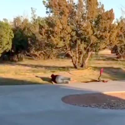 *This video has a second angle with clip #715228* In security camera footage, a senior man runs around a driveway as a young boy chases him in a game of Duck-Duck-Goose before he trips and falls into a bush. Two women help pull him out of the bush and they resume playing the game. No sound.