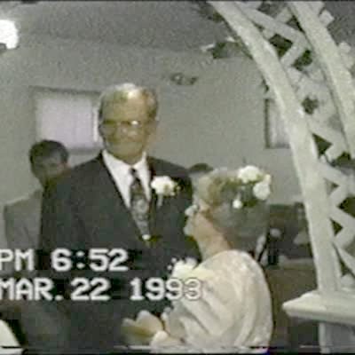 Wedding Surprise. Older couple marry, kiss and bride's wig falls off.