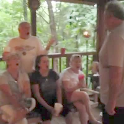 A senior man falls on the porch while he sings the Star Spangled Banner with three senior women and another senior man. Drunk