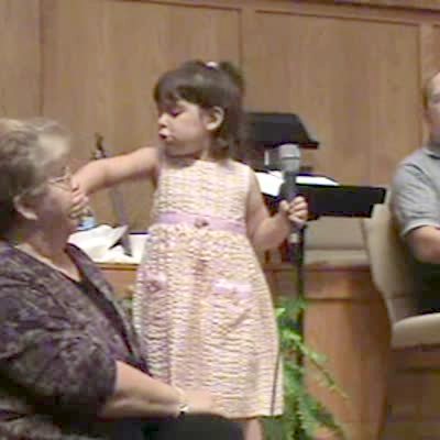 Tot girl onstage covers her grandma's mouth while senior woman sings at church. Girl wants to sing by herself. Performance problems.
