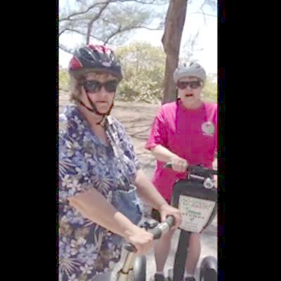 Two senior women stand on Segways and say hello to their families through the camera before one of the women loses control of her Segway and falls down.