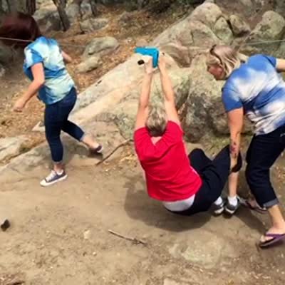 A senior woman tries to zip line with the help of two adult women. One woman trips and then hits her head on the line and the senior woman is too close to the ground outdoors.