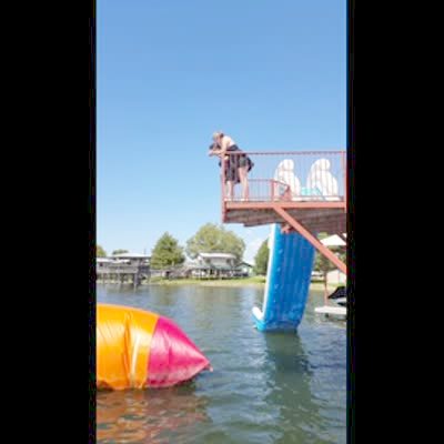 A woman records a video of two other women on top of a platform above a lake and says that they're scared to jump off the platform onto the inflatable pad in the water below them. A senior woman climbs up onto the platform and jumps off to encourage them, but she lands flat on the side of the pad and falls into the water.