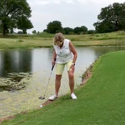 A senior woman hits a golf ball off of a water hazard bank but it goes backwards and rolls into the water behind her.
