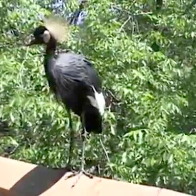 Peacock at zoo stands on a railing. Man says "he won't hurt you" as it pecks at senior woman's head. Crowned crane.