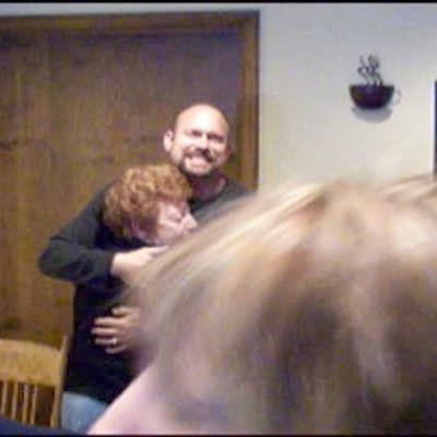 Senior woman in Florida at Christmas on phone with daughter, thinks she is in Chicago. Daughter comes up behind her, makes some faces, womans turns around and is surprised to see her. (2103)