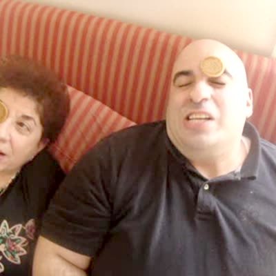 "Cookieface Race" Two men and a senior woman put cookies on their forehead and try to move them into their mouths without using their hands, only moving their face muscles. The senior woman wins getting it in her mouth. Trick Cookie Face Race