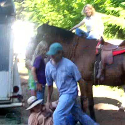 Senior woman on horse tries to dismount onto man's shoulders. They both fall down. . "That was what you call a rough dismount."