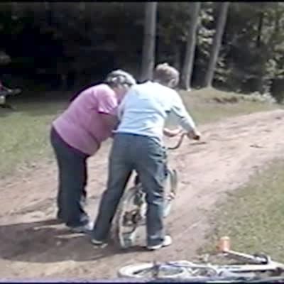 2 senior women help a young girl onto a bicycle. 1 woman sits on a child's bike and the front tire explodes. She screams. Short tails.