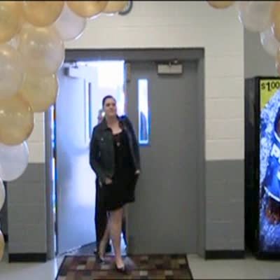 Senior man and woman walk in the door for a surprise anniversary party. Woman faints and other people catch her.