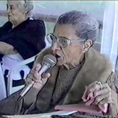 Old lady wishing well on microphone can't remember what celebration she's at, wedding or shower. Senior