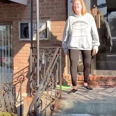A senior woman runs out onto the front entrance of an apartment building when two women surprise her, then she lets go of the door and swears when she realizes that she locked herself out of the building.