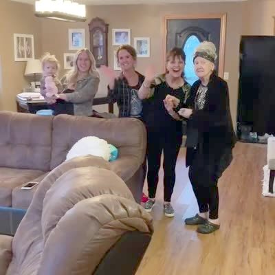 A senior woman holds a cell phone and talks into it, but the women talking to her are in her house.