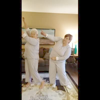 Two senior women dance in a room and try to do the floss dance.