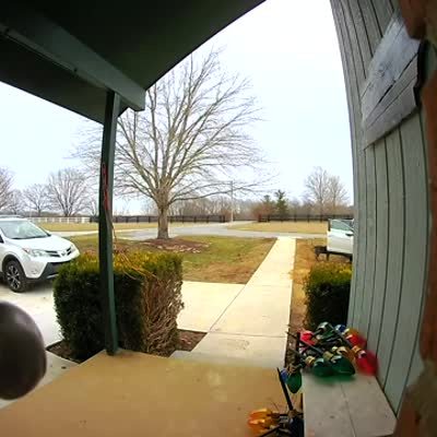Two women and a senior woman walk up to the front door of a house, and a goat follows them, then they yell while one woman tells another to kick the goat. Security footage.