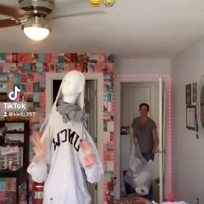 A teen girl dances in a room. Her dad opens the door and watches her twerking. When the girl notices the man, she screams and falls to the floor, embarrassed.