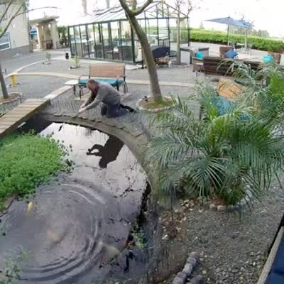 A man drops his phone as he talks on it in his backyard and it lands on a net over a koi fish pond. The man shakes the net as he tries to grab the phone and it falls in the water. Security footage.