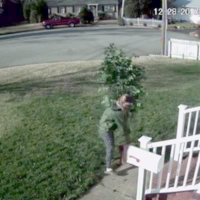 A wild turkey pecks at a security camera in a yard with its beak. Security camera footage.
