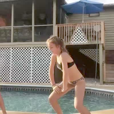 A teen girl dances on the edge of a hot tub and slips and falls onto the patio. Music rights not cleared.