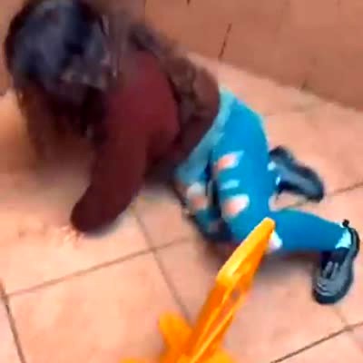 A young girl dances in the living room. Her brother suddenly falls off a couch and kicks her in the face and they both fall. Music rights not cleared.