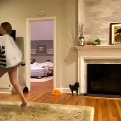 A woman dances in the living room in front of her dog but she stumbles, falls backwards and breaks her glass table. Music rights not cleared.