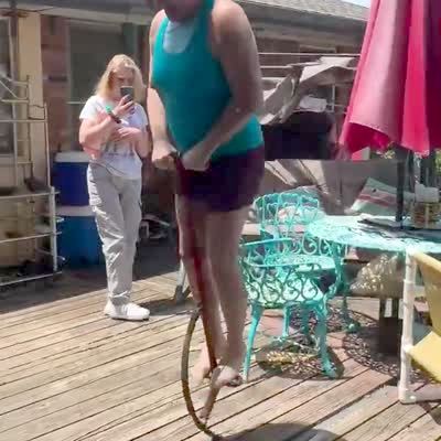 A woman bounces on a Pogo stick, and she falls on the back porch.