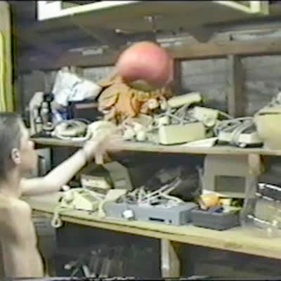 Man dressed in a monster costume hides between shelves & scares co-workers. Several takes, all mild reactions. Practical jokes. Warehouse.