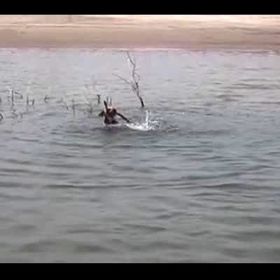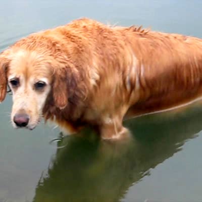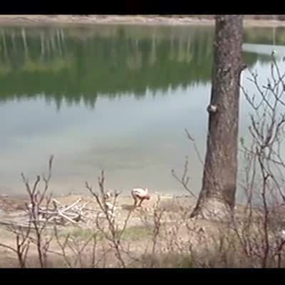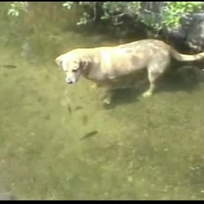 Dog standing in lake watches fish swim around it. Dog dives for fish & catches one in its mouth, taking it to shore. Amazing.