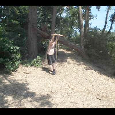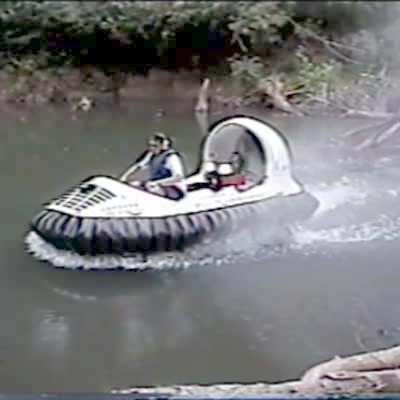 Man rides a hovercraft boat down a river. He rides it onto land and gets stuck on the shore. Man gets out and the engine pushes him into a large stick (tree branch) that pokes man in the butt.