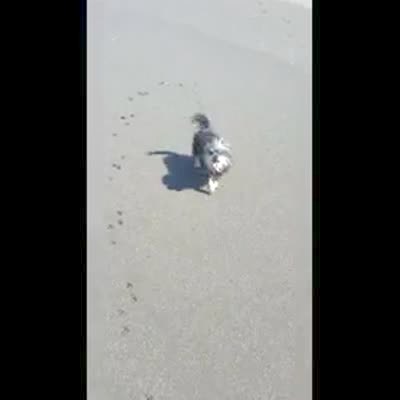A young woman holds food up to a seagull bird on a beach, then screams and runs away while it chases her into the water. Featured talent cleared only (woman scared of the seagull and the man seated beside her).