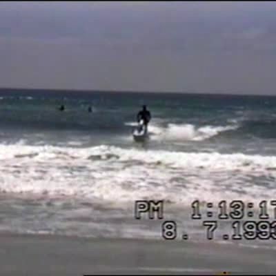 "Shark Fin Freakout" Man, woman and baby standing in water on beach. They look over and a hammer head shark is eating a sting ray.