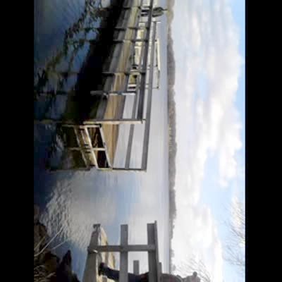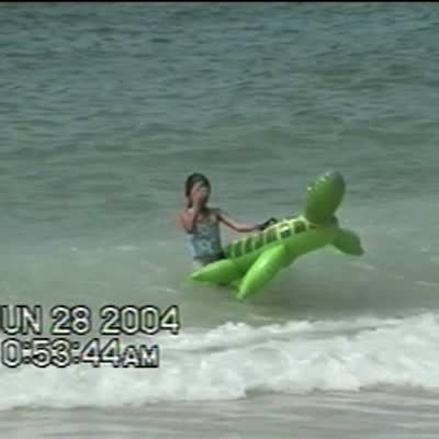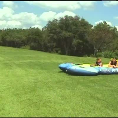 Boy & girl are in inflatable raft, pulled behind a boat. They try to jump a sand mound on the shore but both kids get thrown out of the raft into the lake.