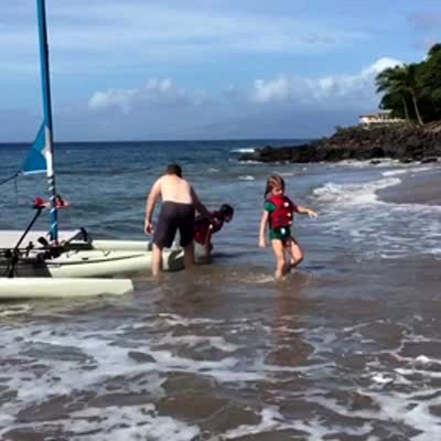 Two kids fall out of sailboat when a wave drops the boat on the shore.