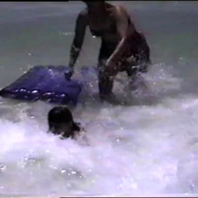 A young girl and two young boys all fall when they run out of the ocean. Featured talent cleared only (the three children who fall in the water)