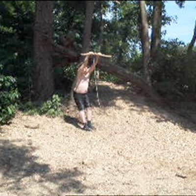 Teen boy falls off a rope swing and slides down a hard rocky hill.