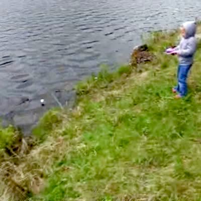 "Rover Rescue" Black Labrador retriever dog first retrieves a floating toy from the water then retrieves a small boy. Brings him up on shore and then drags him around a bit.