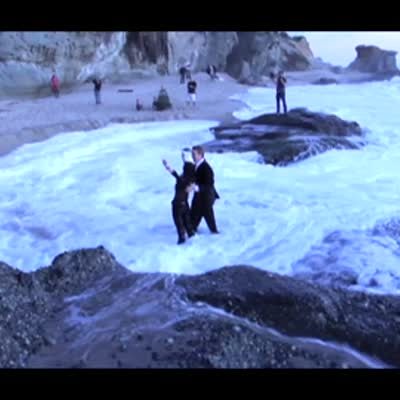 A man wearing a suit gets down on one knee to propose to his girlfriend on top of a bluff in ocean. A wave knocks the two of them back to shore at 0:30.