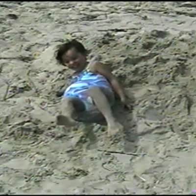 Young girl on beach fills her bathing suit with sand. So much sand she can't stand up. Funny Image, Vacation