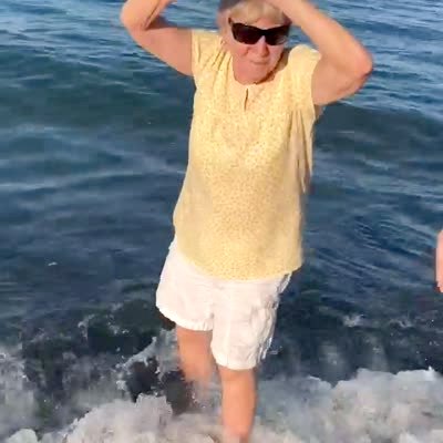 A senior woman dances on the ocean shore, and then she stumbles and falls over in the water.