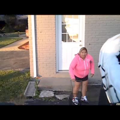 A girl has her head stuck in a bannister rail at home and is shouting at her father to go away rather than helping her. The girl eventually slides out by just climbing through it.