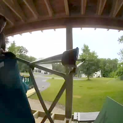 A man walks onto an unfinished porch and tries to sit in a lawn chair. An unsecured plank of wood flips up underneath him, the lawn chair collapses and the man falls through both chair and porch. Security footage.